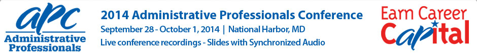 Watch all the conference sessions slides while listening to the synchronized audio, captured LIVE during the 2014 Administrative Professionals Conference. Get this on-demand streaming access to all conference sessions