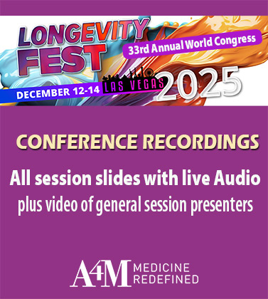A4M Longevity Fest 2025 World Congress on Angi-Aging Medicine conference recordings from December 12-14, 2025 | Las Vegas, NV. Includes all sessions PowerPoint Slides Synchronized with Live Audio - Watch the slides while listening to the synchronized audio. For use on your computer. Includes Video of Presenters for all General Sessions!